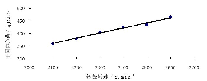 所謂干固體負(fù)荷是指每小時(shí)處理的不揮發(fā)固體重量,以 KgDS(干污泥)/h 表示。調(diào)整離心機(jī)的干固體負(fù)荷,對(duì)污泥脫水效果有很大影響,當(dāng)進(jìn)泥流量(即“水力負(fù)荷”)達(dá)到一定程度,所帶入的懸浮物含量超過了離心機(jī)所能承受的最大干固體負(fù)荷時(shí),會(huì)造成泥餅含水率增加,上清液帶泥增多,此時(shí)應(yīng)該減少進(jìn)泥流量,使離心機(jī)脫出的上清液清澈在實(shí)際運(yùn)行中,必須通過調(diào)整水力負(fù)荷,來保證進(jìn)入離心機(jī)干固體負(fù)荷不超過離心機(jī)的最大承受能力,否則,多余的干固體將從上清液中排出,上清液的懸浮物會(huì)急劇增多,但脫水泥餅的產(chǎn)量并沒有增加。該廠使用的離心機(jī),當(dāng)轉(zhuǎn)鼓轉(zhuǎn)速為 2300rpm、進(jìn)泥濃度為 35 g/L 時(shí),離心機(jī)運(yùn)行的干固體負(fù)荷可達(dá) 405kg/h。當(dāng)離心機(jī)磚鼓轉(zhuǎn)速增加時(shí),干固體負(fù)荷也會(huì)相應(yīng)增加,圖 3 是最大干固體負(fù)荷隨離心機(jī)轉(zhuǎn)鼓轉(zhuǎn)速變化的曲線。