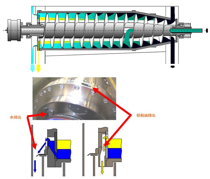 三相離心機結(jié)構(gòu)主要由差速器,螺旋,轉(zhuǎn)鼓、罩殼、機座、潤滑系統(tǒng)、電機等部分組成。其工作原理是:懸浮液經(jīng)進料管、螺旋出料口進入轉(zhuǎn)鼓。在高速旋轉(zhuǎn)產(chǎn)生的離心力作用下,比重較大的固相顆粒沉積在轉(zhuǎn)鼓內(nèi)壁上,與轉(zhuǎn)鼓作相對運動的螺旋葉片不斷地將沉積在轉(zhuǎn)鼓內(nèi)壁上的固相顆粒刮下并推出排渣口,不同比重的液相會在轉(zhuǎn)鼓內(nèi)形成兩道液環(huán),經(jīng)大端蓋的兩個不同的出口流出。